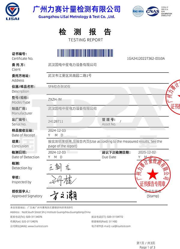 | ZXZH-IK | 微水、純度、分解物(SO2、H2S、CO、HF) |